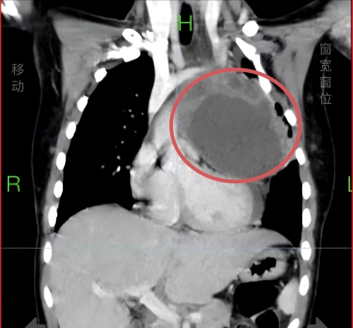 术前胸部增强CT发现患儿左侧胸腔巨大肿瘤(红圈内) 佘科霖主任、颜建华副主任医师团队为患儿实施手术 近日,湖南省人民医院胸外科团队成功为一名13岁女孩摘除了直径达1