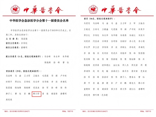 近日,中华医学会急诊医学分会换届选举大会于北京圆满落幕。经大会严格审议、遴选及民主表决,湖南省人民医院急诊医学科主任韩小彤凭借深厚的学术积淀与突出的行业贡献,成功当选分会常务委员。