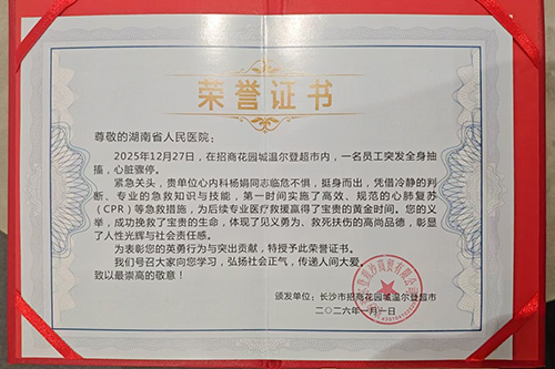 超市负责人为杨娟颁发荣誉证书 “虽然这份感谢来得有些晚,但代表了我们超市全体员工最诚挚的心意。”1月8日,湖南省人民医院心血管内科一病区主管护师杨娟收到了一份特别的致谢,长沙某超市负责人