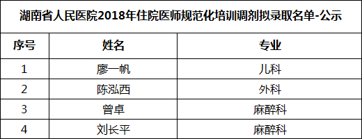 湖南省人民医院2018年住院医师规范化培训调剂拟录取名单-公示