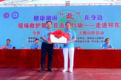 9月5日上午8时30分,“健康湖南‘救'在身边”现场救护第一目击者行动祁东站活动在县政府广场举行,湖南省人民医院院长祝益民、副院长向华分别将“现场救护第一目击者联盟”旗帜和牌匾授予祁东县人民医院院长彭平和、党总支书记张上峰。