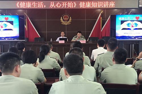 长沙机场边防领导致辞中提出,长沙机场边防官兵工作性质特殊,压力大,健康生活指导匮乏,迫切需要医疗专家进行相关干预,湖南省人民医院派出一流专家现场指导,为我站官兵心身健康提供有力保障。心血管内六科刘显庆主任向在座官兵做了《健康生活,从心开始》知识讲座,刘主任用生动幽默,风趣互动等方式,从心脑血管疾病年轻化,危险因素,主要临床表现,防治急救,健康生活干预等方面做了全面讲解,官兵们聚精会神,现场反响热烈。