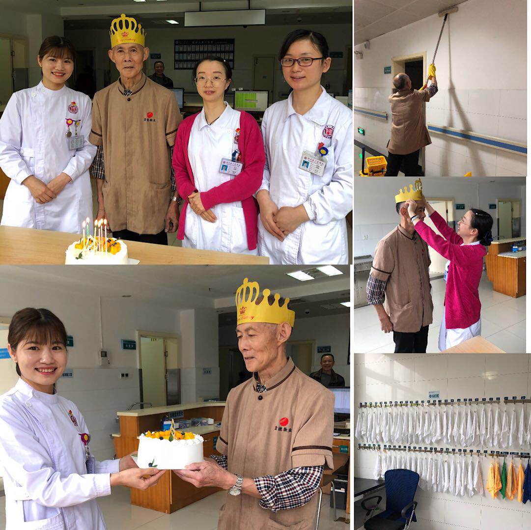 5月17日,是内分泌二科卫生员邓嗲嗲60岁的生日。一大早,内分泌二科护士长李柳就精心准备了一个精美的生日蛋糕,准备为邓嗲嗲过生日。但寿星邓嗲嗲在干什么呢?一如既往的在默默的工作,一早为病人收垃圾,病房的地板清洁,打开水,擦拭病房墙面等。