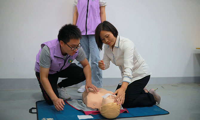 急救实践操作练习过程中,来自湖南省人民医院的15名医护人员志愿者认真负责,对学员们详细分解急救措施要领,并手把手地进行操作手法的指导和纠正,博才白鹤小学校长王谢平、副校长刘星星带头参与,参训教师们都热情高涨,反响热烈并积极参与。