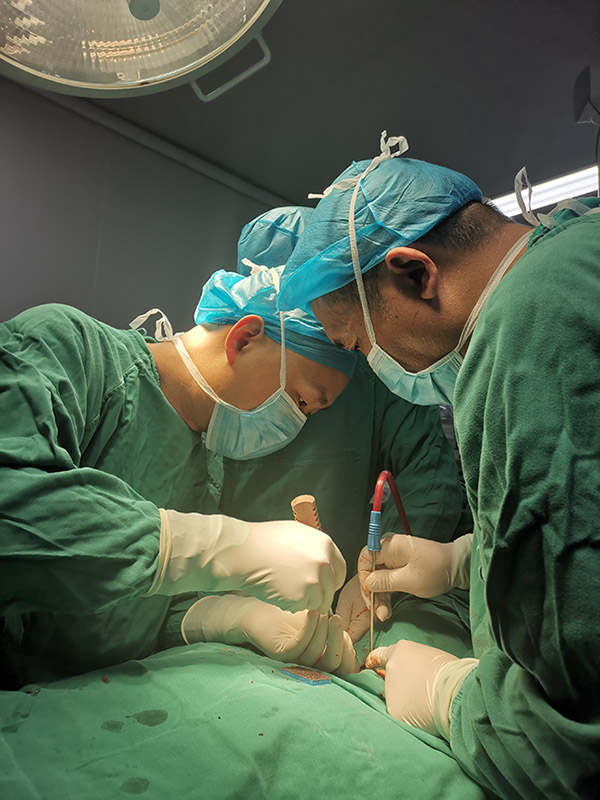 根据MRI结果回报,专家组考虑,患者第3颈椎平面高位瘫痪,且瘫痪平面呈进行性升高,将很快影响到生命中枢,危及患者生命。根据专家组讨论意见,刘景诗做出紧急手术的决定。由湖南省人民医院刘宏哲教授主刀,与张家界市人民医院覃大海主任医师共同手术,连夜为患者实施全麻下“颈椎前路C5椎体次全切除+椎管扩大减压术+椎间盘摘除术+前路钛网钛板内固定术+后路切开复位内固定术+气管切开术”。手术从27日凌晨1时开始,持续7小时顺利完成。将患者安全送回重症医学科病房,刘景诗带领3位专家再次在重症医学科进行术后查房,指导术后下一阶段治疗方案,交代病情观察和专科护理注意事项。