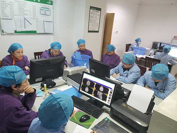应急救援专家组于26日12:30从长沙出发,经过近5个多小时的车程,抵达张家界。顾不上吃饭和休息,专家们下车之后立即前往张家界市人民医院重症监护室查看患者。患者男性,49岁,脊髓损伤后高位截瘫,病情十分危重。专家组认为当前需要紧急完善核磁共振检查(MRI),以确定下一步治疗方案。因患者之前已经历过慈利县到张家界市一次转运,为避免导致二次损伤,确保安全,专家组成员寸步不离、全程陪同到放射科,完成了核磁共振。