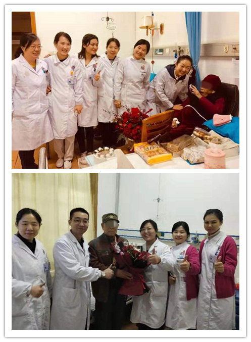 在科主任廖斌和陈海燕护士长的带领下,医生护士齐聚老人们的病房,带去鲜花蛋糕,带去最美祝愿,带去欢乐笑声。