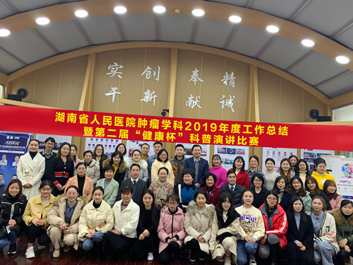 2020年1月11日下午,我院肿瘤科两院区全体医护技人员齐聚一堂,召开2019年度总结大会暨第二届“健康杯”科普演讲比赛。院党委副书记黄利华、护理部专员黄利华、原肿瘤科主任肖佩玲、干部保健办专员胡立珍应邀参加会议并担任比赛评委。