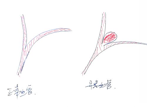 左侧为正常血管,右侧血管分叉处长动脉瘤。 绘图:张晓泉