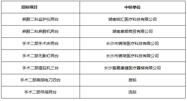 2020年 4月24日,我院医学设备部在监审部的监督下,组织相关部门和专家举行招标会议,对各单位投标文件分别进行了综合评审,现将招标结果公示如下: