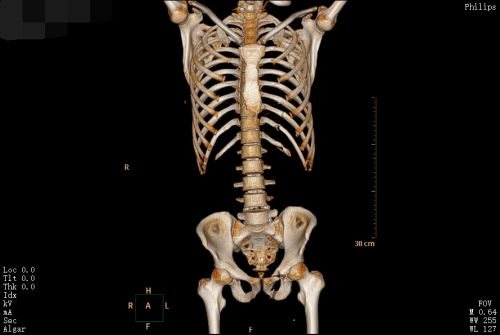 术前CT显示:左侧第4-12肋多发骨折,骨盆骨折。