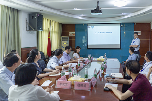 省人民医院派往祁东县人民医院任副院长的王庆向调研组汇报集团医院成立以来工作情况。