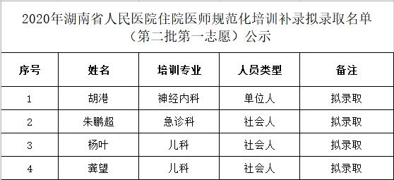 2020年湖南省人民医院住院医师规范化培训补录拟录取名单(第二批第一志愿)公示