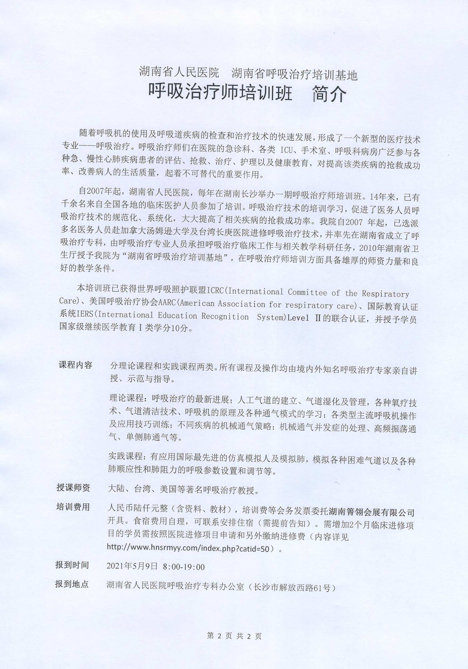 湖南省人民医院 湖南省呼吸治疗培训基地呼吸治疗师培训班报名通知