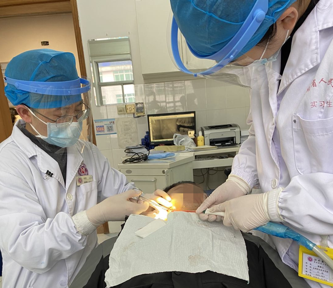 袁先生到口腔二科就诊时,右下面部已经出现了约3×2cm大小的脓包,经过详细询问和检查,原来袁先生两年多以前就出现了智齿反复发炎疼痛的情况,却因为常年嚼槟榔嘴巴张不开,开口度不足1.5指,多处求医无果,在口腔二科,徐裕国副主任医师查看了袁先生的情况后表示,袁先生的病情不能再拖了,希望尽最大努力帮助他拔除智齿,袁先生热泪盈眶。接下来的拔牙手术过程中,袁先生全程尽力配合张大口,拔牙器械勉强才能放进口里,过程艰难,历经一个小时,智齿最终被完整拔除,并进行了脸上脓包的切开排脓、包扎,袁先生如释重负,多次鞠躬感谢。