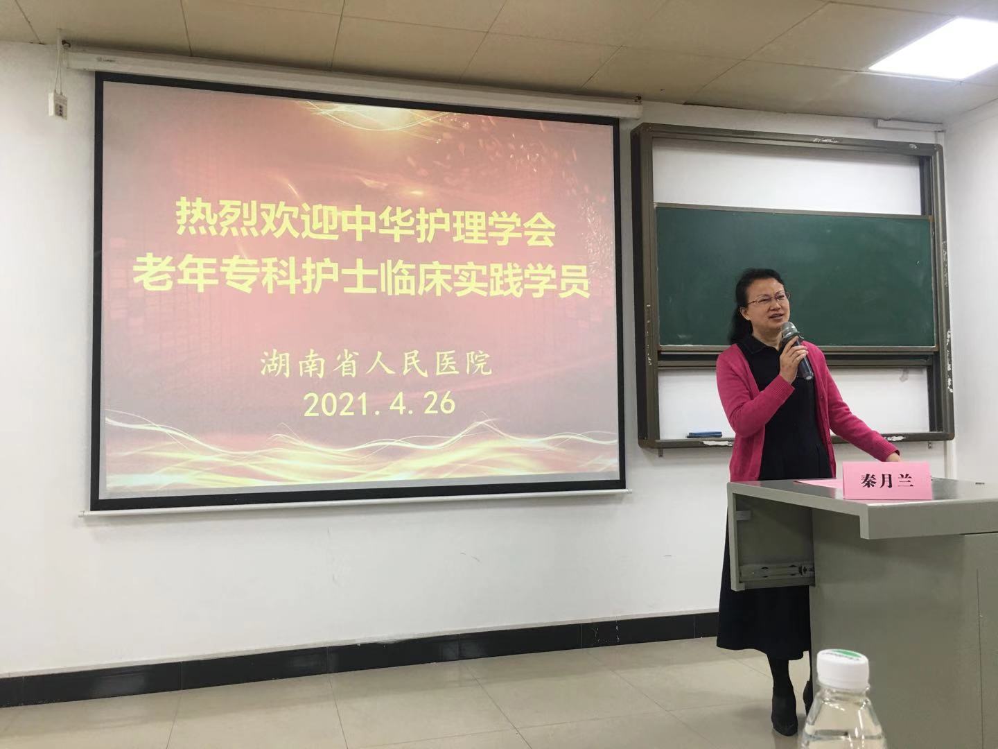 4月26日上午,中华护理学会第二期老年护理专科实践学员到我院学习,副院长秦月兰出席开班仪式,马王堆院区护理办副主任兼老年临床教学基地负责人唐三辉、护理质控办副主任沈周敏、老年医学科主任梁力晖、老年三科主任廖斌、老年三科主任医师彭友、各临床实践科室护士长、一对一带教老师以及来自重庆、江西、广西、湖南的8位学员参加开班仪式。