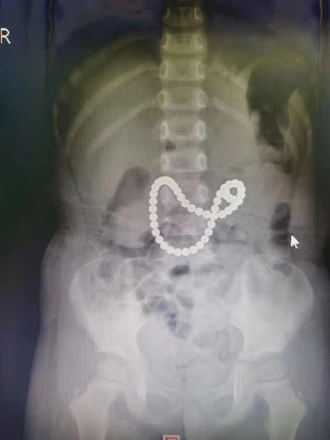 5月6日,小欢被家人送入湖南省人民医院儿童医学中心,同来的奶奶表示,这些天她带小欢到长沙的姑姑家玩,昨天孩子突然开始腹痛、恶心、呕吐,估计是急性肠胃炎犯了。接诊的袁子杰副主任医师详细询问病史,结合检查结果,建议做X线检查排除异物可能。没想到X线结果显示,小欢消化道内有多颗珠子状的异物,这些珠子连接成串,十分惊人。