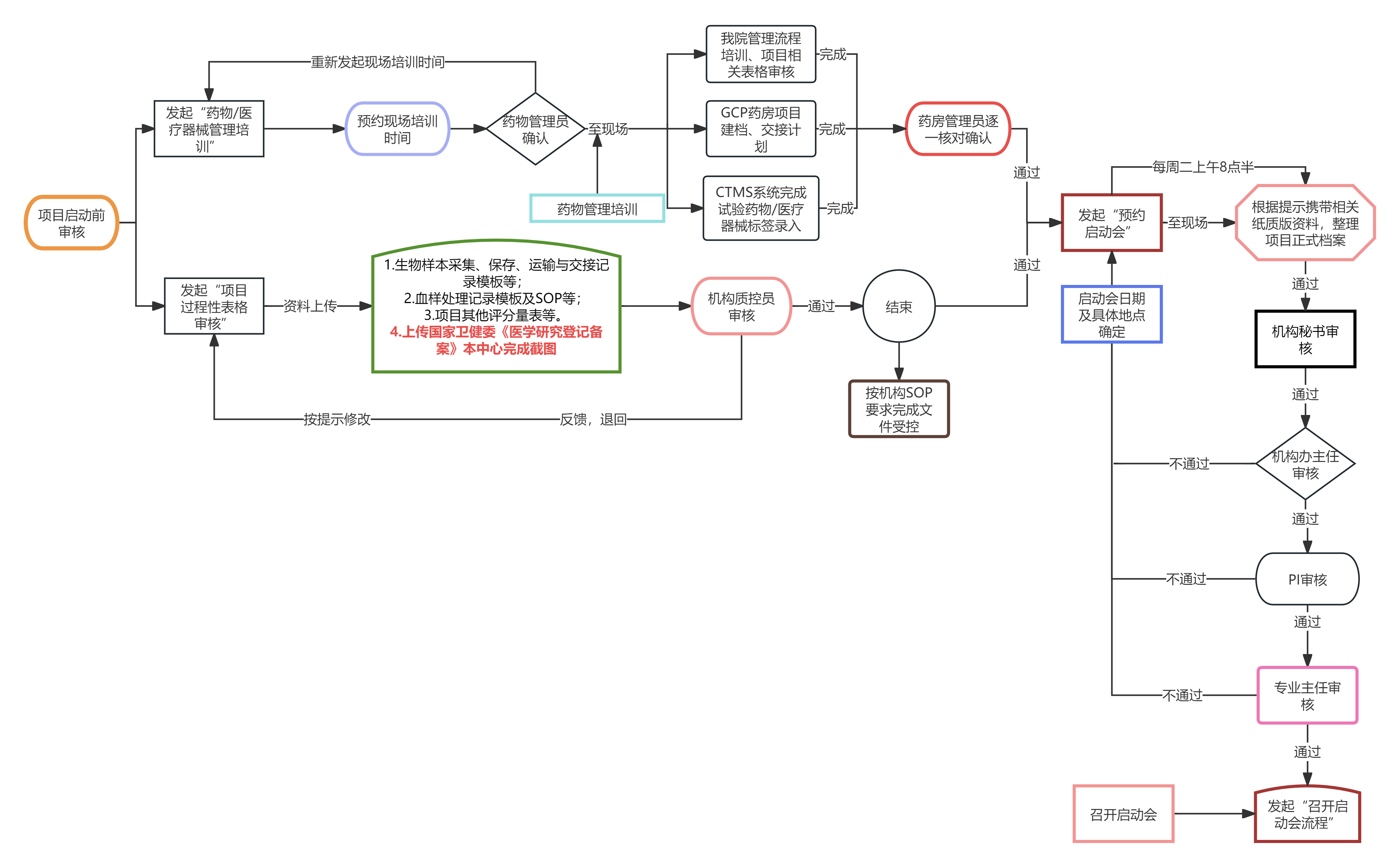 1. 成功发起“启动会预约” 后至机构办进行项目资料整理及启动前培训:每周二上午8:30(若遇节假日顺延一周);审核地点:机构办公室(天心阁院区综合楼504办公室);参与人员:负责我中心CRA、CRC;原则上于启动会召开之前一周进行。