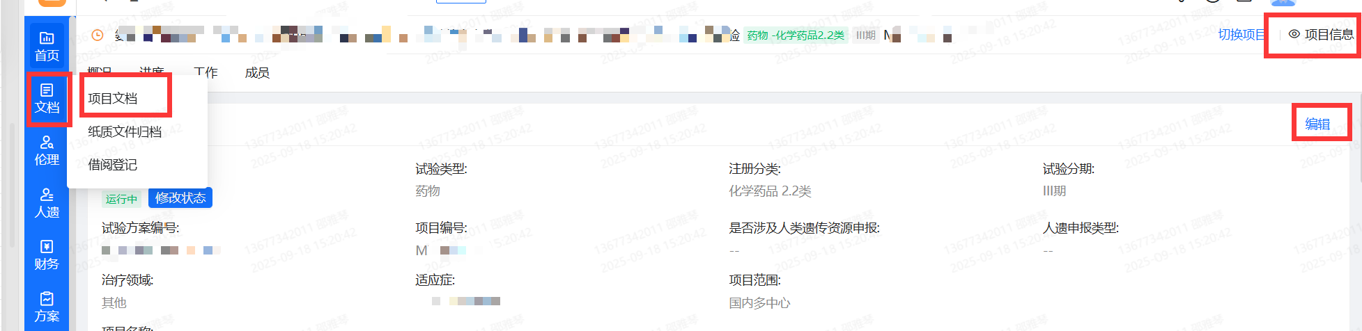 2)若项目(仅限在CTMS发起“项目立项”的项目)至伦理系统发起的所有审查资料若已归档至CTMS-“文档”-“项目文档”处,须维护文档“移动”至对应文件夹,并检查所有版次是否完全。