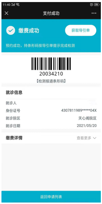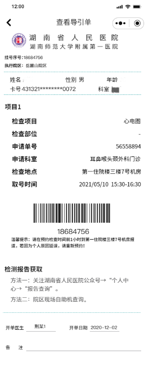 进入“湖南省人民医院互联网医院”—— 选择“我的”—— “检查检验”——选择“检查检验申请”查看“导引单”,获取检查地点和取号时间。