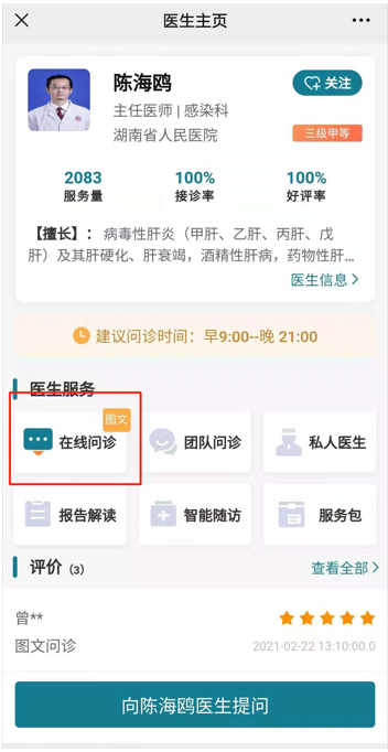 选择“在线问诊”——选择”向XX医生”提问