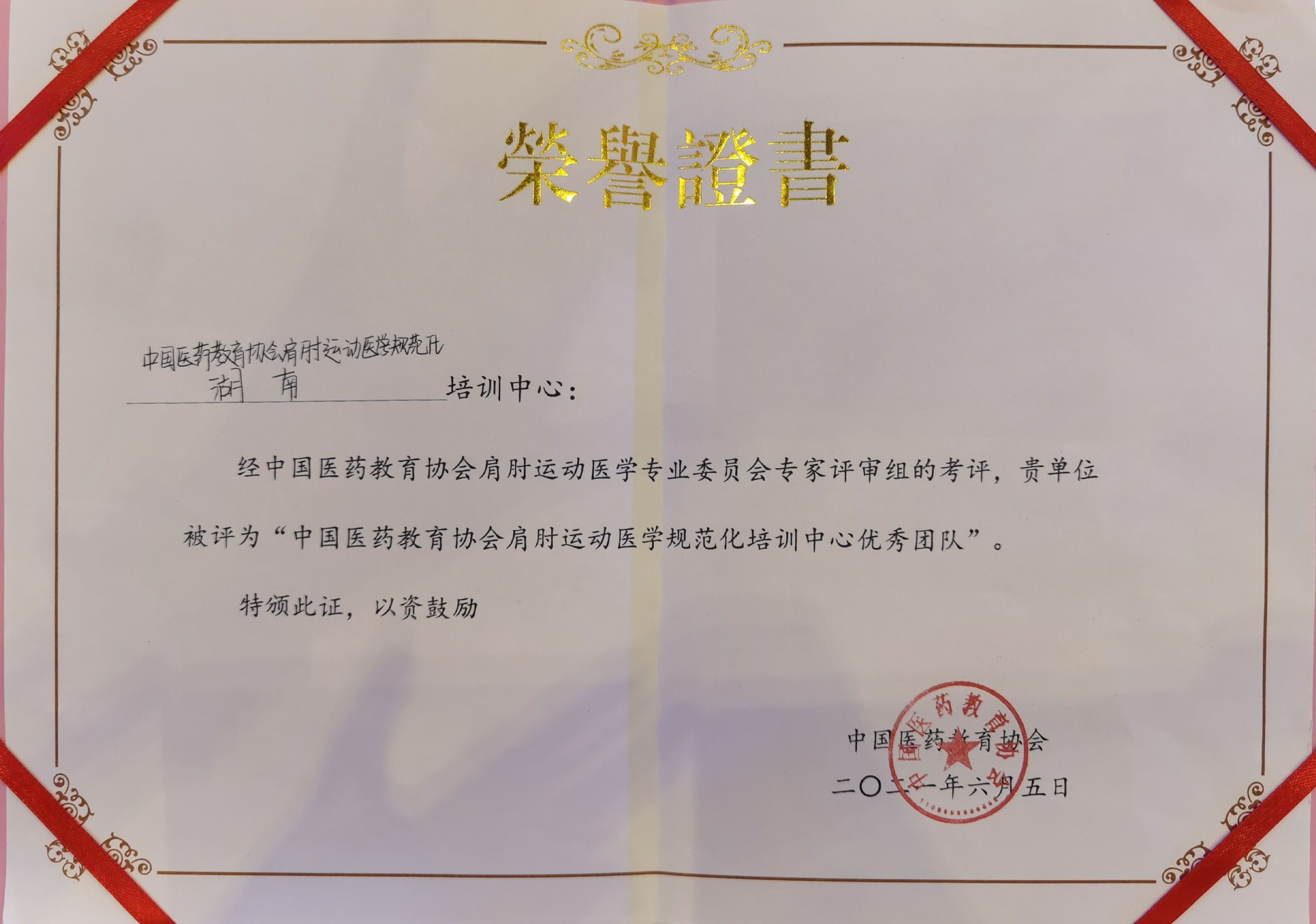 中国医药教育协会肩肘运动医学专业委员会规范化培训中心(湖南)成立4年来,一直致力于肩关节规范化诊疗理念技术在湖南省内的推广,此次荣誉的获得,充分肯定了湖南肩肘培训中心在推动湖南肩肘运动医学的发展中所做出的佳绩和贡献,中心将继续在推动湖南肩肘运动医学专业发展和创新道路上精耕细作,不忘初心,再创佳绩。(骨关节与运动医学科 蒋浩)