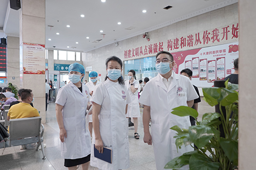会后,各院领导立即带队开展督查工作,谭院长亲自带队对门诊、儿科门急诊、第三住院楼、发热门诊等重点岗位进行督查。强调医务人员务必增强防控意识,加强个人防护,强化落实门诊预检分诊各项流程,尤其要详细进行流行病史询问和各入口的健康码和行程码检查,做好一人一诊室,候诊区保持一米线距离,对发热门诊患者进行闭环管理。目前我院就诊秩序良好。