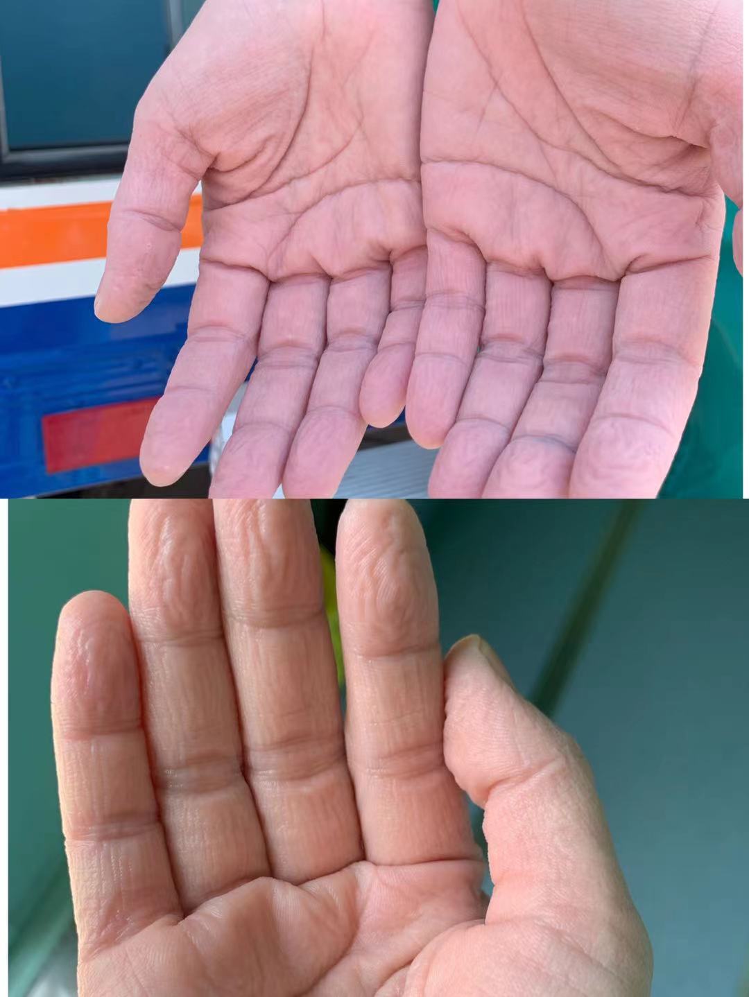 脱下防护服以后被汗水打湿的衣服和起皱泡白的手