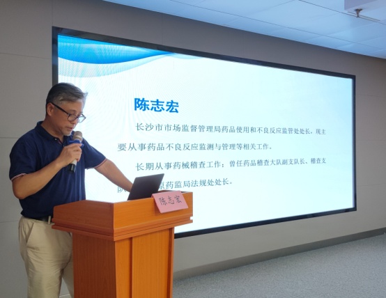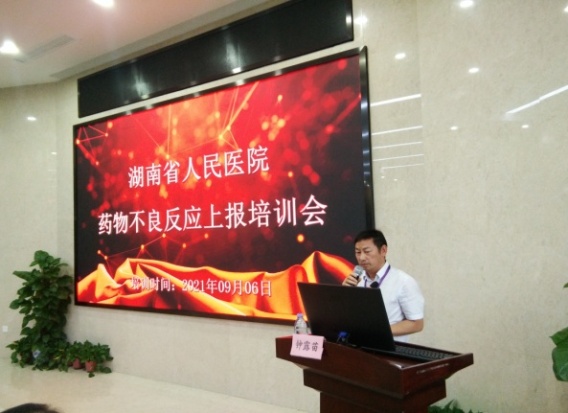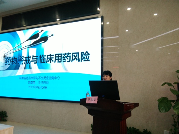 会议邀请长沙市市场监管局药品使用和不良反应监管处处长陈志宏、湖南省药品审评与不良反应监测中心主任钟露苗博士现场授课。我院副院长李泉清、药学部负责人出席会议,医务部药政办主任邓银华主持会议。
