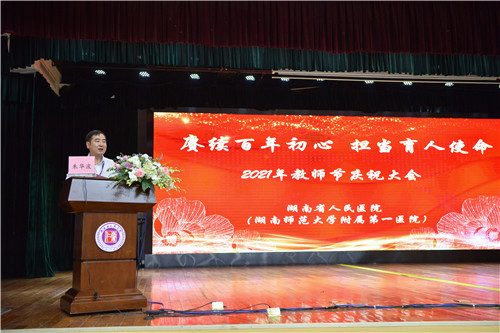 为庆祝第37个教师节,9月10日,湖南省人民医院(湖南师范大学附属第一医院)在天心阁院区综合楼二楼大礼堂召开教师节庆祝大会暨教学工作会议,总结过去一年的教学成果,表彰为医学教育工作做出杰出贡献的教职员工和教学团队。