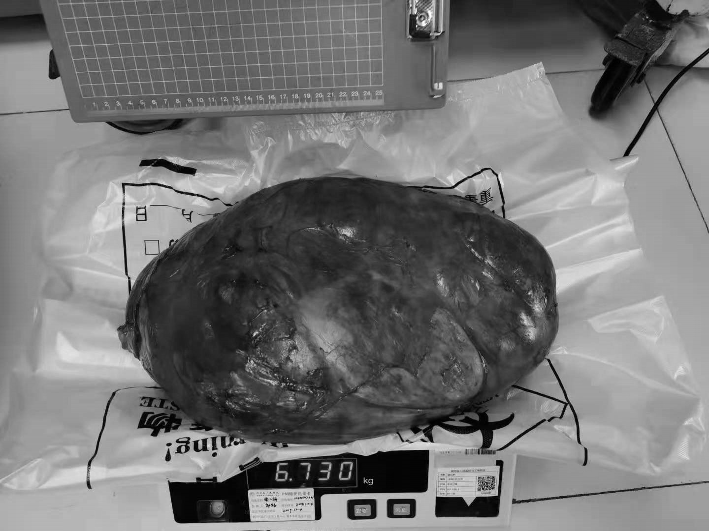 经缜密的术前准备,蒋先生接受了手术。手术由顾如山主任医师主刀、兰思根博士协助,在保护好其他脏器的前提下尽量完整切除脂肪肉瘤,手术非常成功,完整切除了大约36✘30✘15cm,重约6.73Kg的肿瘤,术后病理报告为去分化脂肪肉瘤。