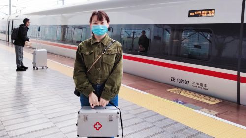 护士蒋维乘高铁前往岳阳,为老人上门服务。