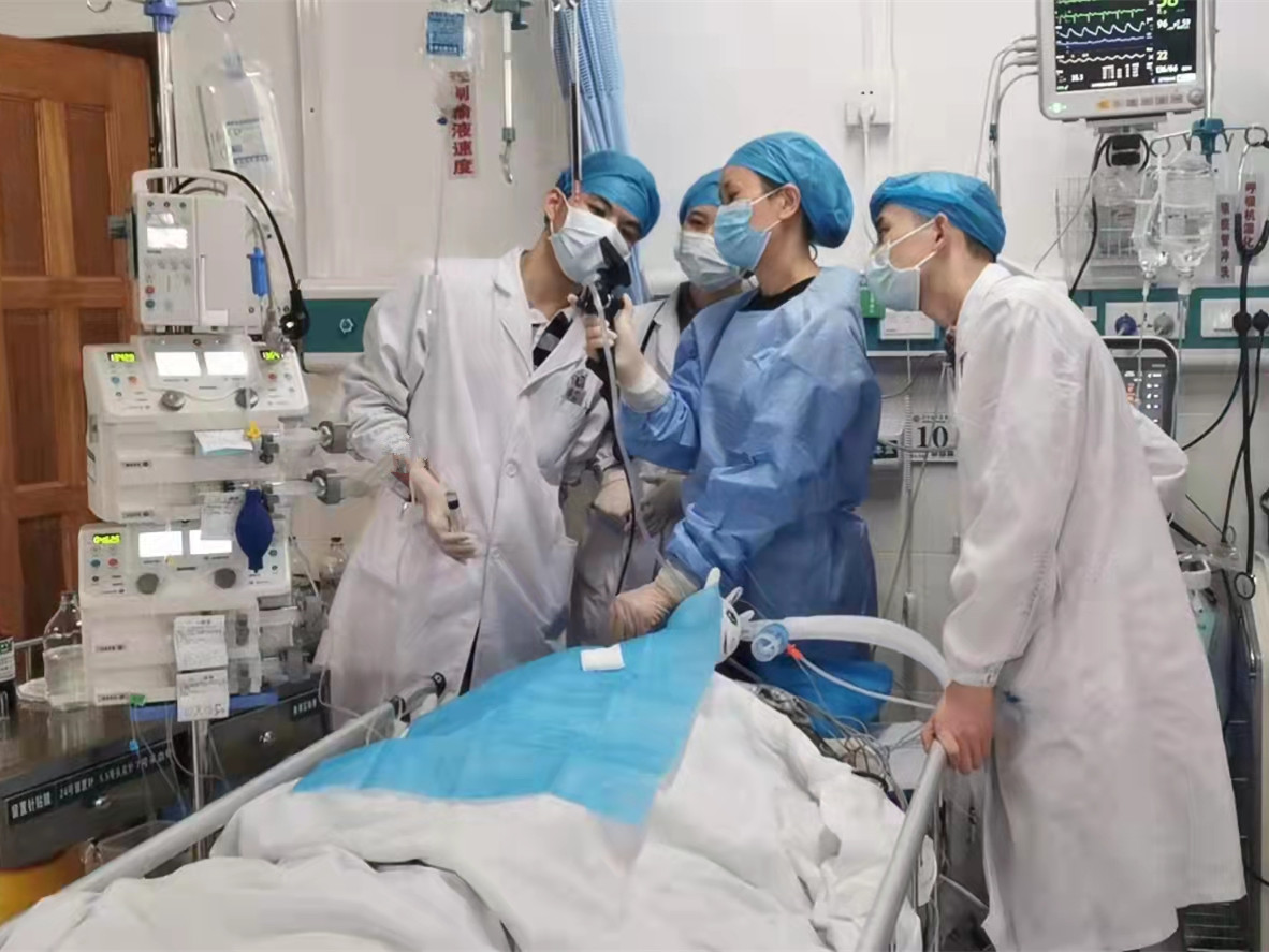 靖颖霞副主任医师为汪大爷进行紧急气管插管,由于汪大爷儿时有被大火烧伤头面部的经历,在医生插管开放气道时,发现他的呼吸道也在火灾中被烧伤,全是斑驳的瘢痕,给插管大大增加了困难,在靖颖霞副主任医师经过一番努力,为汪大爷插管成功,将其抢救回来,在急诊二科EICU继续治疗。