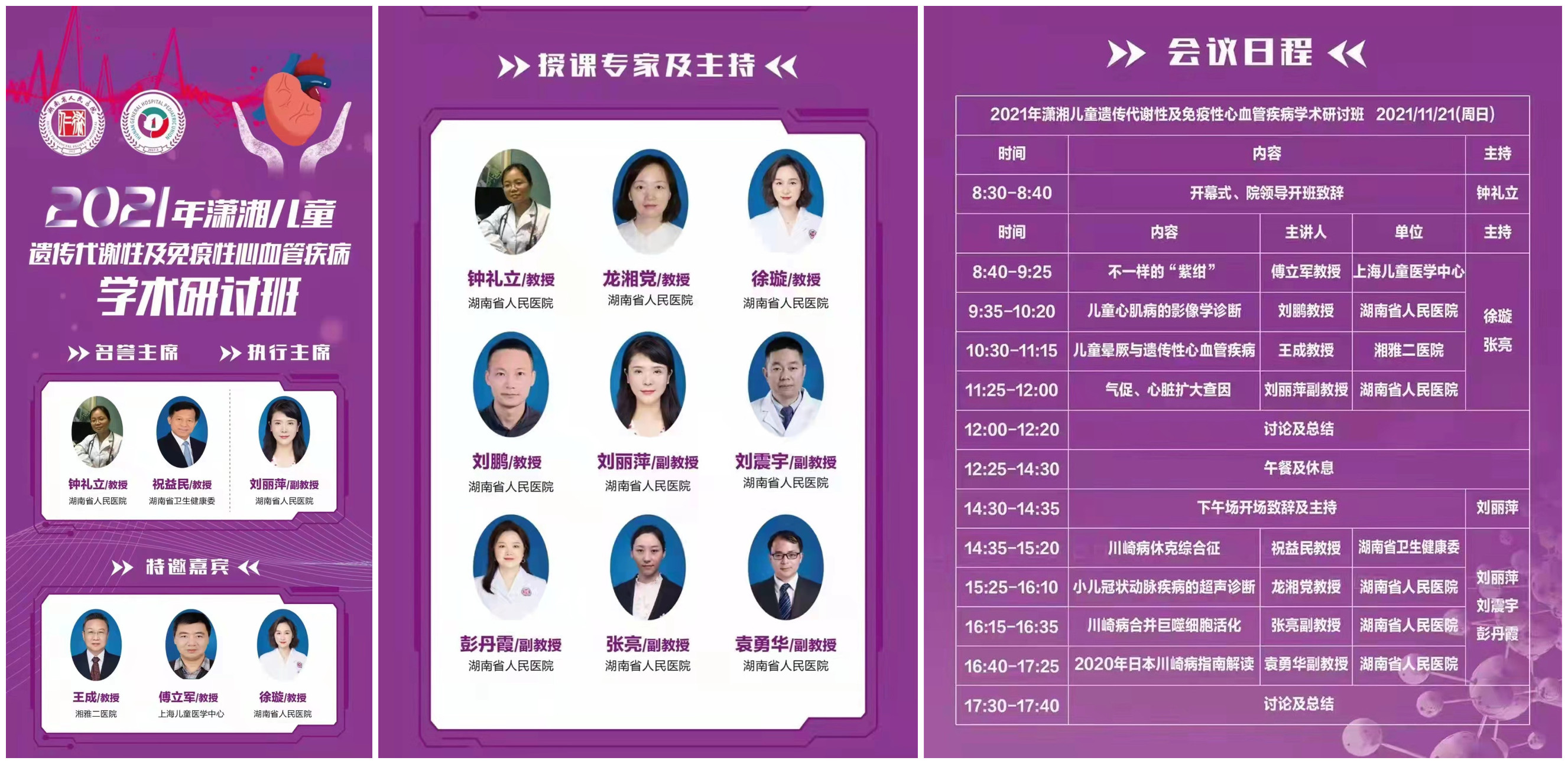 湖南省人民医院儿童医学中心主任钟礼立主持开幕式,湖南省人民医院常务副院长向华教授出席会议并致辞,儿童心血管亚专科刘丽萍副主任医师担任此次大会执行主席。会议还邀请了湖南省卫健委副主任祝益民教授、上海儿童医学中心心内科主任傅立军教授、湘雅二医院儿童医学中心儿童心血管科主任王成教授,湖南省儿童医院肖云彬教授以及本院儿童医学中心主任钟礼立教授、儿童内分泌心血管科主任徐璇教授、超声医学科主任龙湘党教授、放射一科主任刘鹏教授、刘震宇副主任医师、彭丹霞副主任医师、张亮副主任医师、袁勇华副主任医师等多名国内及省内儿童遗传代谢及心血管疾病相关领域的知名专家参加。