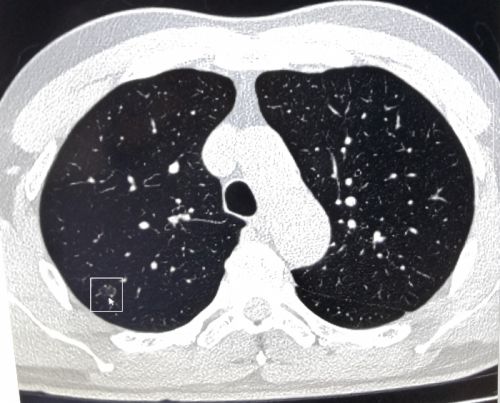 张先生体检时肺部ct筛查影像显示有可疑结节(箭头处)。