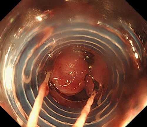 彭娅主任在内镜下小心翼翼抽吸血液清洗血块后,找到“犯罪血管”。
