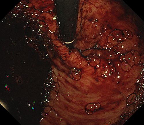 内镜下可见重度食管静脉曲张,且有较多血凝块。