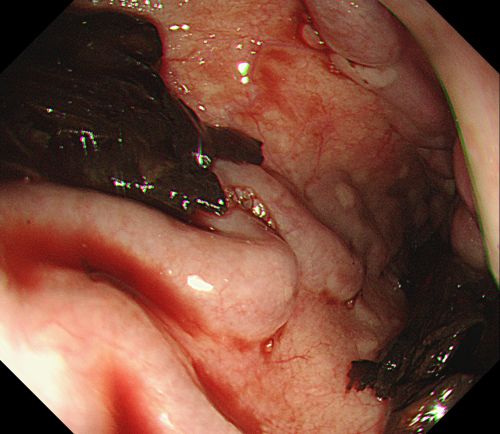 内镜下胃底可见大量血液及血凝块。