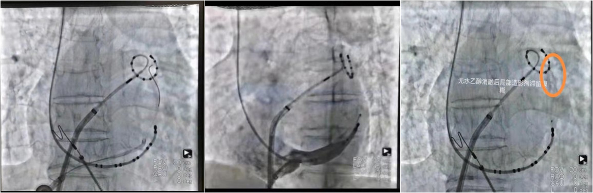 术中,手术团队首先房间隔穿刺将环肺标测电极放置肺静脉前庭,发现较大电位,随后经股静脉将导管送至冠状窦内造影见Marshall 静脉显影,沿PTCA导丝将OTW球囊送入Marshall静脉内,扩张封堵后经中心腔将无水酒精缓慢注Marshall 静脉内,在Marshall 静脉远段注射2ML、近段注射3ML,内膜面呈低电压,CS1-2电位变小。