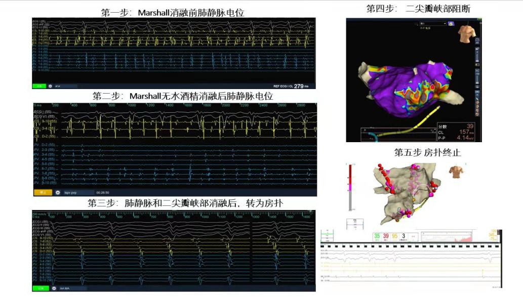 患者为63岁女性,心脏扩大,心功能下降,长期心室率接近200次/分,气促胸闷症状明显,长期受房颤困扰,严重影响生活质量,遂慕名来我院就诊,寻求手术治疗。由容志毅主任,周柳荣副主任医师带领的心律失常团队经过综合会诊认为,由于该患者为长程持续性房颤,心房基质纤维化较严重,单纯肺静脉隔离效果差,需要行二尖瓣峡部、三尖瓣峡部消融以增加成功率。但由于Marshall 静脉参与外膜传导,传统内膜消融很难达到完全阻滞,不完全阻滞会增加术后二尖瓣峡部依赖房扑的发生率,长时间的消融又会增加手术风险。于是决定为患者行房颤导管消融+Marshall静脉无水乙醇化学消融术,以保证患者有良好的预后。