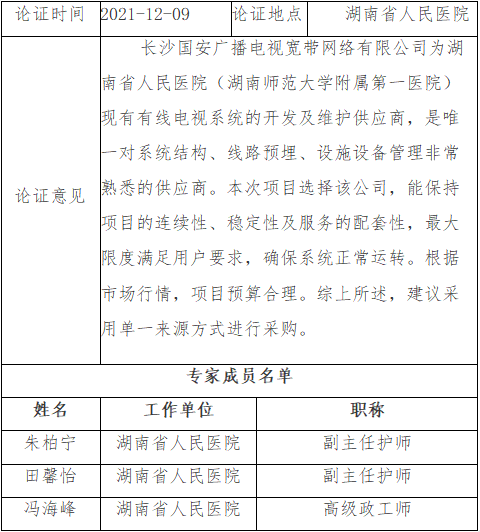 天心阁院区和马王堆院区的有线电视一直以来均为长沙国安广播电视宽带网络有限公司建设和维护,两个院区使用同一套有线电视管理系统,系统适配了本院自办节目“仁术TV”的播出。采取单一来源方式采购,能保证两个院区有线电视系统的稳定运行以及更好的服务支撑。