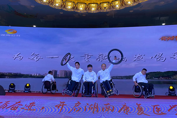 大会上著名女主持人梁艺为我们分享了她在湖南省人民医院康复医学科进行康复训练、重建内心、突破自己的心路历程,给我们讲述了她原本被宣判只能在病床上度过余生,通过专业系统的康复治疗后能够在轮椅上完成力所能及的事、继续深造学习、重返舞台的故事。之后的日子,她时常鼓励像她一样遭遇不幸的病友重拾生的希望和对生活的热情。她说康复医学是充满希望与爱的学科,感谢康复医学帮助病友在疾病之后走出黑暗、迈向新生。现场还邀请了一群同样因为疾病和意外伤害失去步行能力的轮友表演轮椅秀,用顽强坚韧的精神和铿锵有力的表演向我们展示着生命的力量。