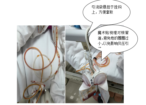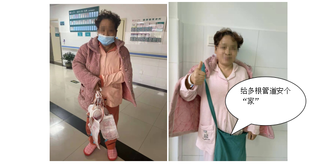 因为植入了乳腺假体,刘阿姨身上有皮内皮外、假体内假体外四根负压引流管,管道长又多,导致患者不想做术后的康复训练。看到患者行走时有的拿衣架挂着引流袋,有的用塑料袋装引流袋,乳甲外二科的护理团队秉持“不断从细小之处优化患者的就医体验”的宗旨,及时发现临床问题,解决患者难题。