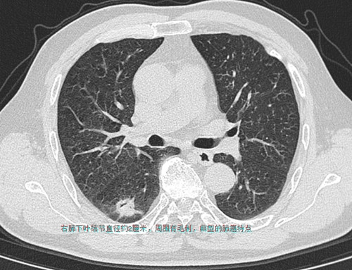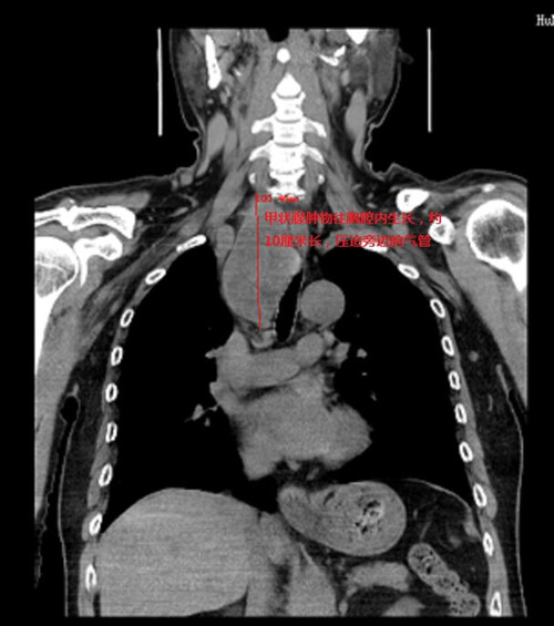 66岁的周嗲嗲家住马王堆,因气促咳嗽在湖南省人民医院呼吸五科住院,胸部CT检查发现在右肺下叶有一个约鹌鹑蛋大小结节,同时在纵膈发现一巨大肿物压迫气管引起狭窄,经胸外科会诊,右肺下叶结节肺癌的可能性非常大,纵膈肿物是颈部甲状腺肿瘤往胸腔内长压迫气管,两个问题都要手术治疗。