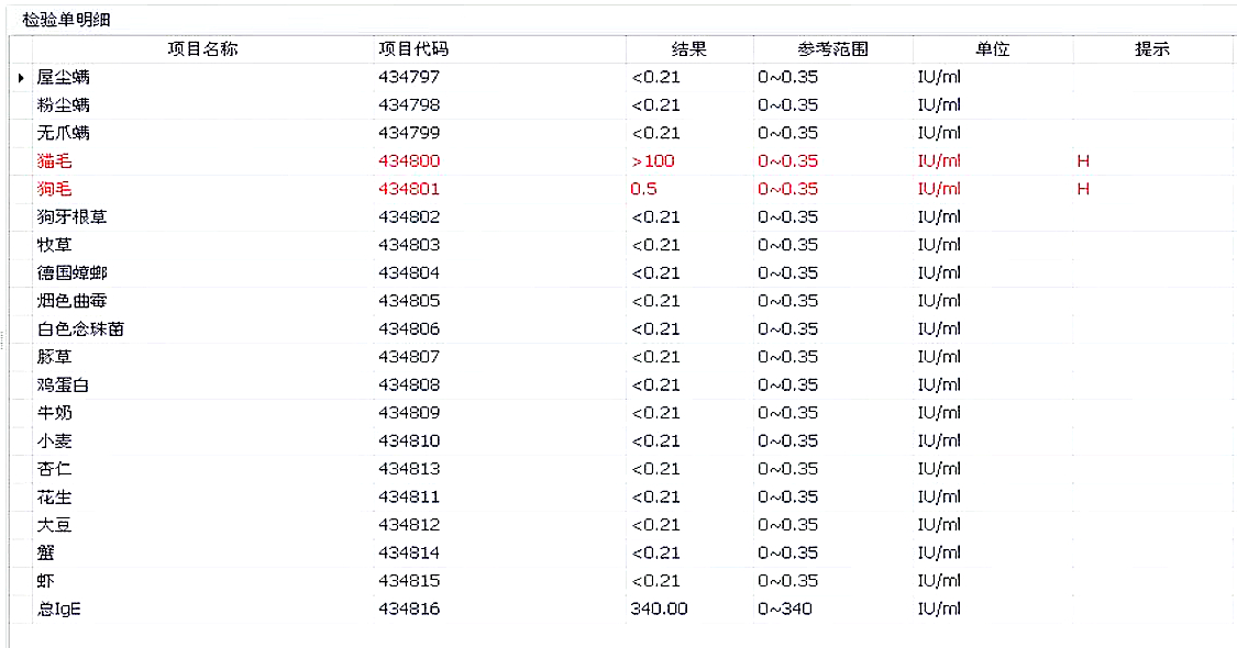患者过敏源筛查显示对猫毛和狗毛过敏