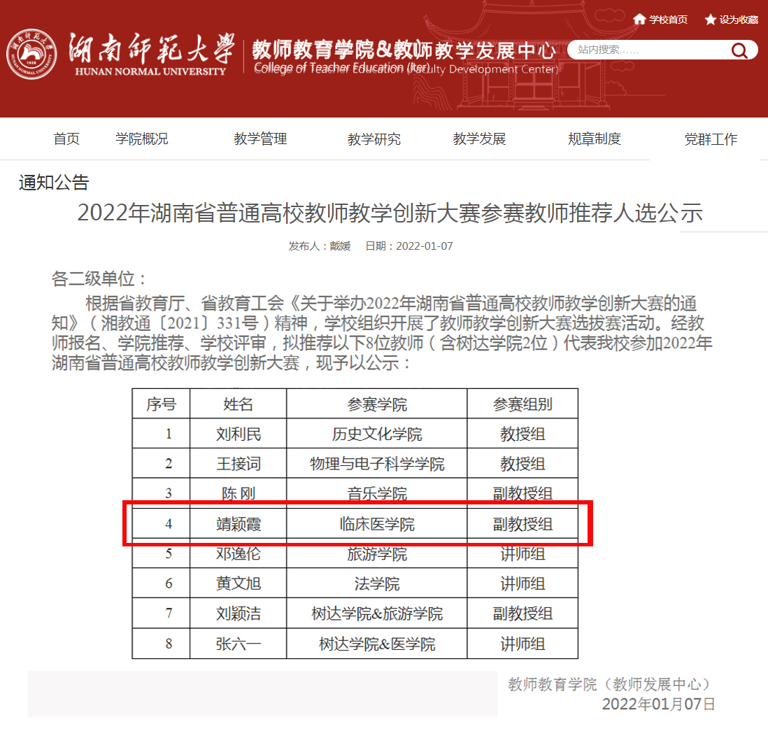 1月6日,湖南师范大学举办了全国高校教师教学创新大赛(校赛),全校24个学院共48支团队参赛。我院急诊与重症医学教研室派出由靖颖霞、韩小彤、曹彦和熊选政组成的《第一目击者现场急救》教学团队,获得了副教授组的一等奖,入选参加省赛。