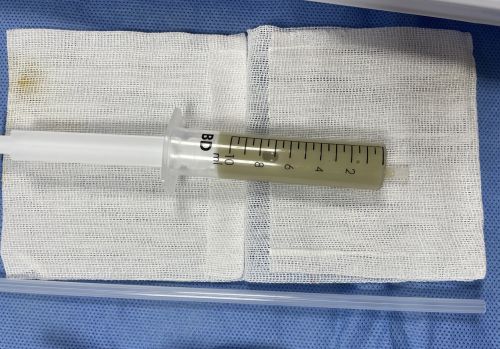1月19日,在超声科赵康副主任医师B超引导下,高智勇主任医师医疗组成功为患者施行右肾细管造瘘术,引流出脓性积液。