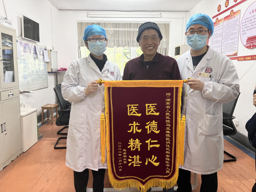 1月24日,寒冷的冬天,病房一如既往的忙碌着,走廊上一位手里拿着锦旗的胡嗲嗲迎面走来,紧紧握着廖江涛主任的手感激的说:“谢谢您和您的团队,让我能安心过大年。”一面写着“医德仁心,医术精湛”的字样锦旗是胡嗲嗲对医护人员最大的肯定。