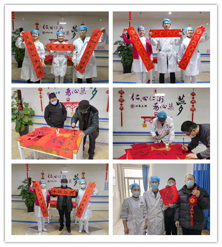 年味是亲朋好友们团聚的快乐,然而,在举国欢庆的佳节里,医院的有些病友们暂时不能与家人团聚,为了让病友们感受到温暖,湖南省人民医院心内三科潘宏伟主任、吴娟护士长,组织了医务人员给病友们写春联送祝福活动,刘辉护士提笔写下“平安如意,吉祥如意百年顺,万事平安幸福年”赠送给病友。病友们收到医生护士手写的祝福,纷纷来到书写台和医护人员共同书写。