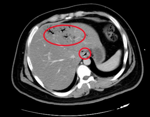 ct显示,肝脏、门静脉、肠壁内都有明显积气(红圈内)。